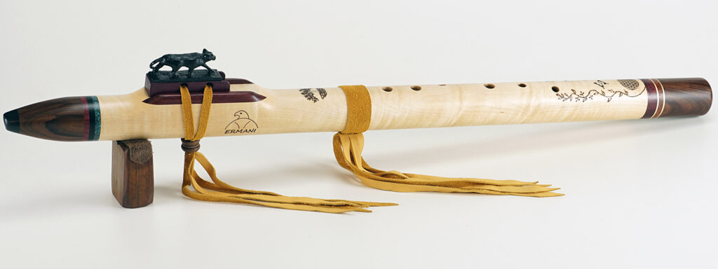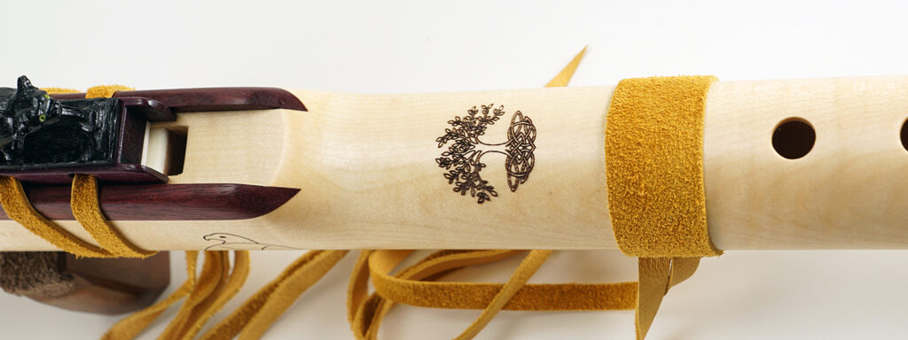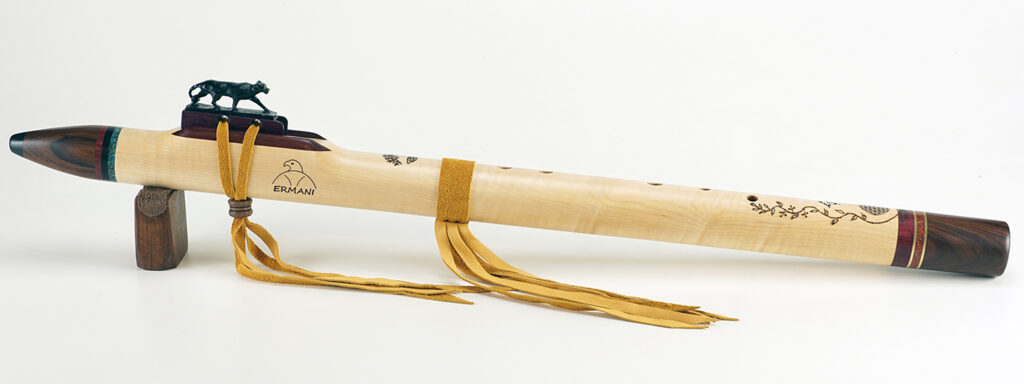 C1150 Ermani Bassflöte in Birke, Adlerblock in Birne. Sehr schlank gebaute Bassflöte mit einem guten Klang. Überblasen ins 2. Register ist durch die Bauart nur begrenzt möglich. Größter Lochabstand 3,5 cm, größter Lochdurchmesser 12 mm. Durch die moderaten Lochabstände ist die Flöte auch mit kleineren Händen noch gut zu greifen.