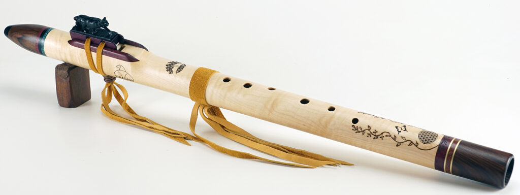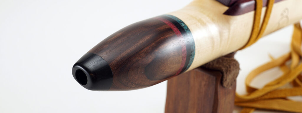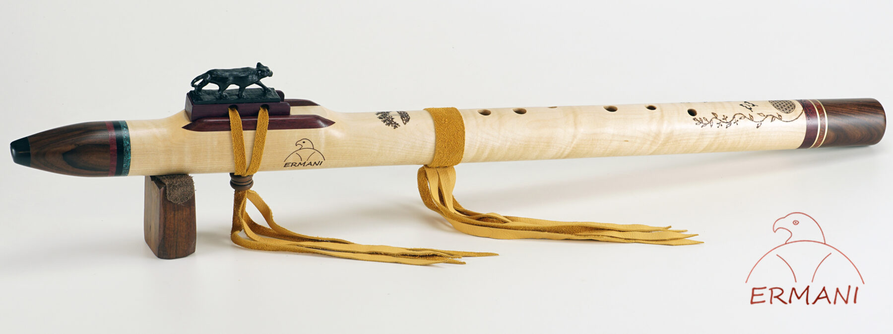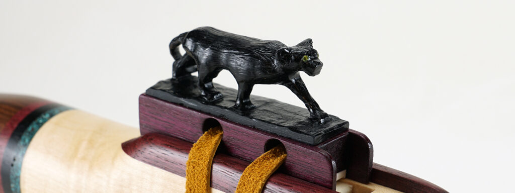 C1152 Ermani Bassflöte in Riegelahorn und Santos Palisander. Geschnitzter Block in Pantherform aus Ebenholz. Akzentringe hinter dem Hornmundstück in Ameranth, Ebenholz und echtem Türkis, Akzentringe am Endstück in Ameranth, Messing und echtem Jaspis. Schultern in Ameranth. Die Flöte kommt bereits mit einem eingebauten Nässeschutz.