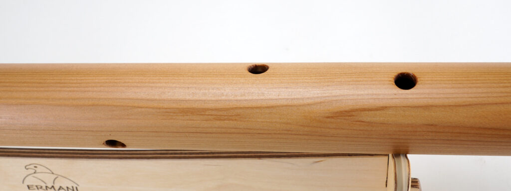 E1702 Ermani E-Bassflöte in Western Red Zeder. Mundstück, Block sowie Kopf und Endstück in Nussbaum, Akzentringe in Riegelahorn. Die Flöte vereint traditionelle Handwerkskunst mit einem einzigartig warmen und meditativen Klang. Ihre tiefe Stimmung in E-Moll erzeugt erdende Schwingungen, die Körper und Geist in Einklang bringen.