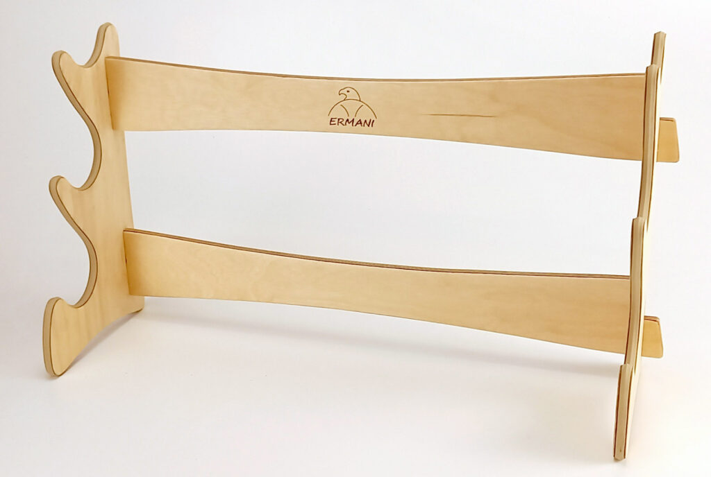S0100 Ermani Flötenständer für eine Flöte aus geöltem Birkensperrholz mit umlaufender Gummiauflage zum Schutz und sicherer Auflage der Flöte. Der Flötenständer wird zerlegt geliefert und ist ohne Werkzeug einfach zusammenzubauen.