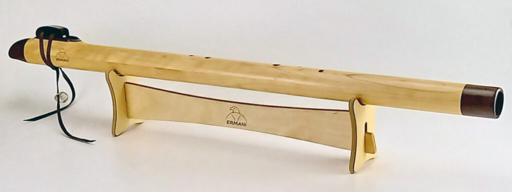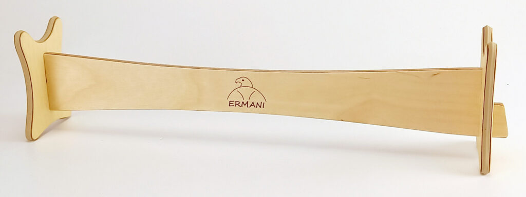 S0120 Ermani Flötenständer für eine Bassflöte aus geöltem Birkensperrholz mit einem längeren Mittelteil und einer umlaufender Gummiauflage zum Schutz und sicherer Auflage der Flöte. Der Flötenständer wird zerlegt geliefert und ist ohne Werkzeug einfach zusammenzubauen.